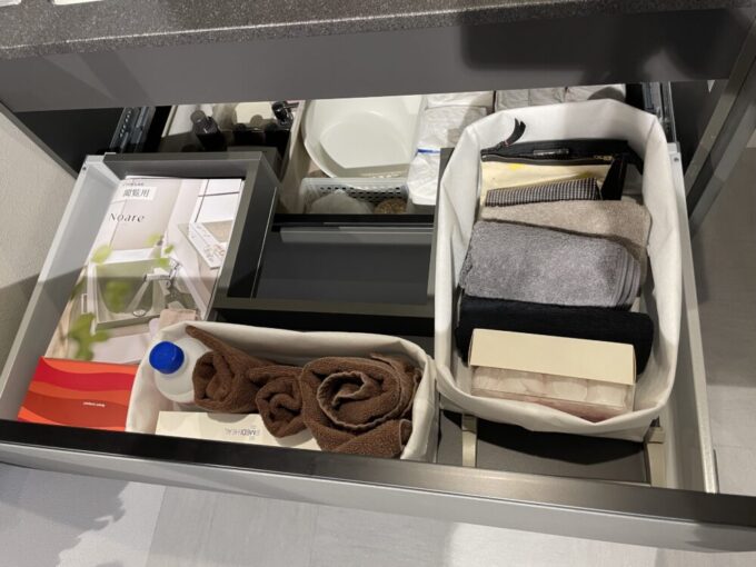 洗面所は限られたスペースに多くのものを収納する必要がある場所です。Noareはこの課題に対して、巧みな収納設計で応えています。