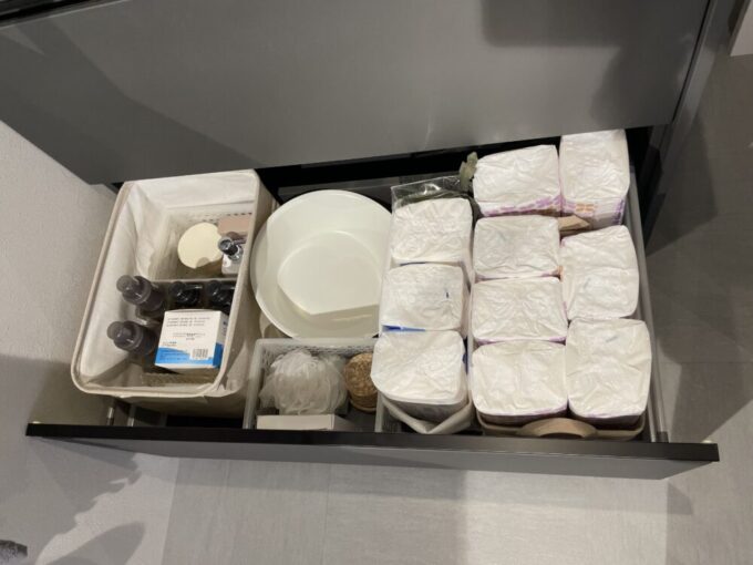 下部のキャビネットは引き出しタイプが標準で、奥のものまで見渡しやすく取り出しやすい設計になっています。従来の観音開きタイプと比べて、デッドスペースが少なく、収納効率が格段に向上しています。