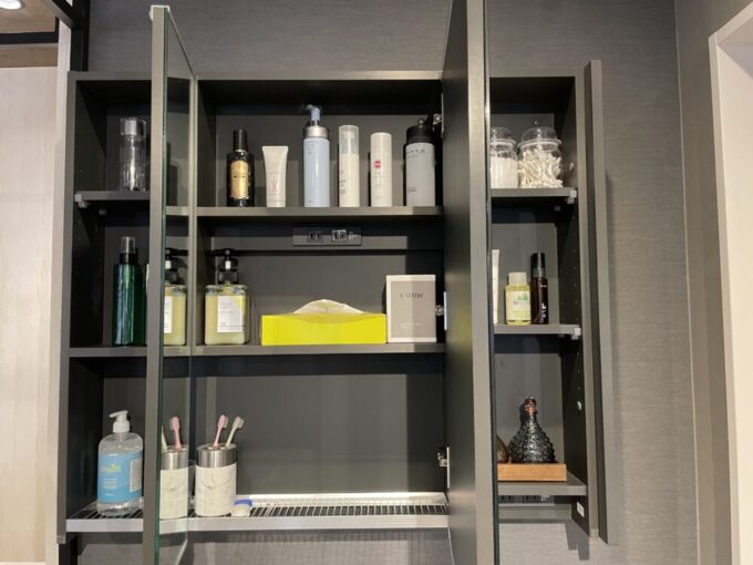 三面鏡の裏側には、化粧品や洗面用品をたっぷり収納できるスペースが確保されています。棚の高さを調整できるタイプもあり、背の高いボトルから小物まで、効率よく収納することができます。